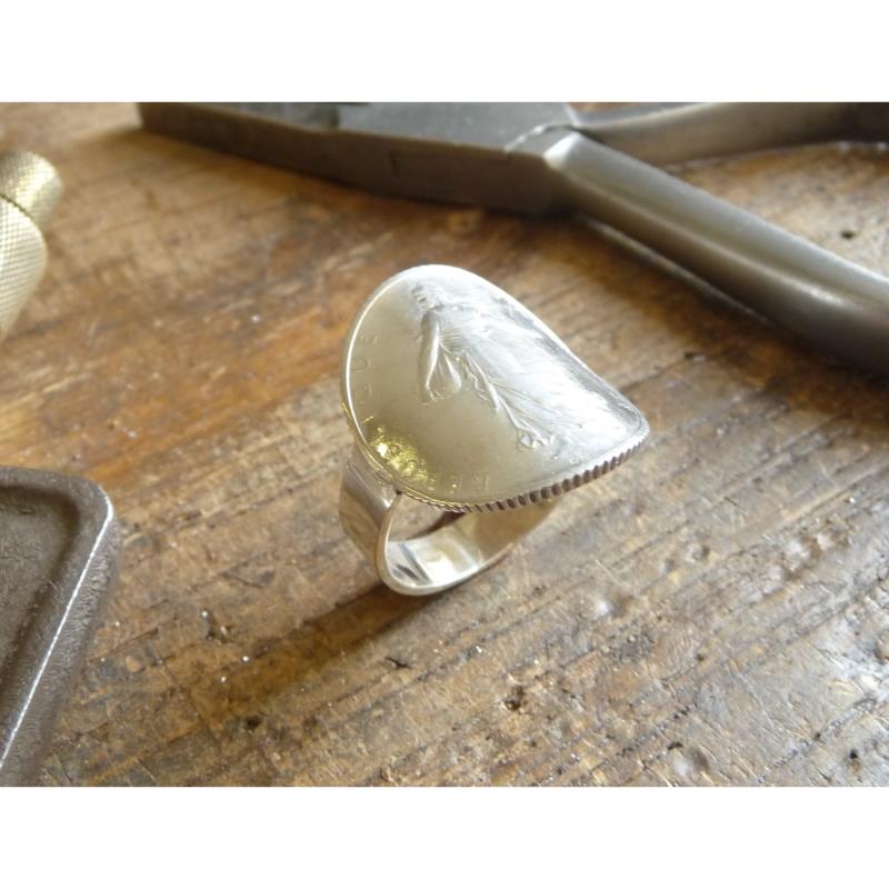Bague pièce cintrée pièce de 1 Franc Semeuse en argent sur corps droit