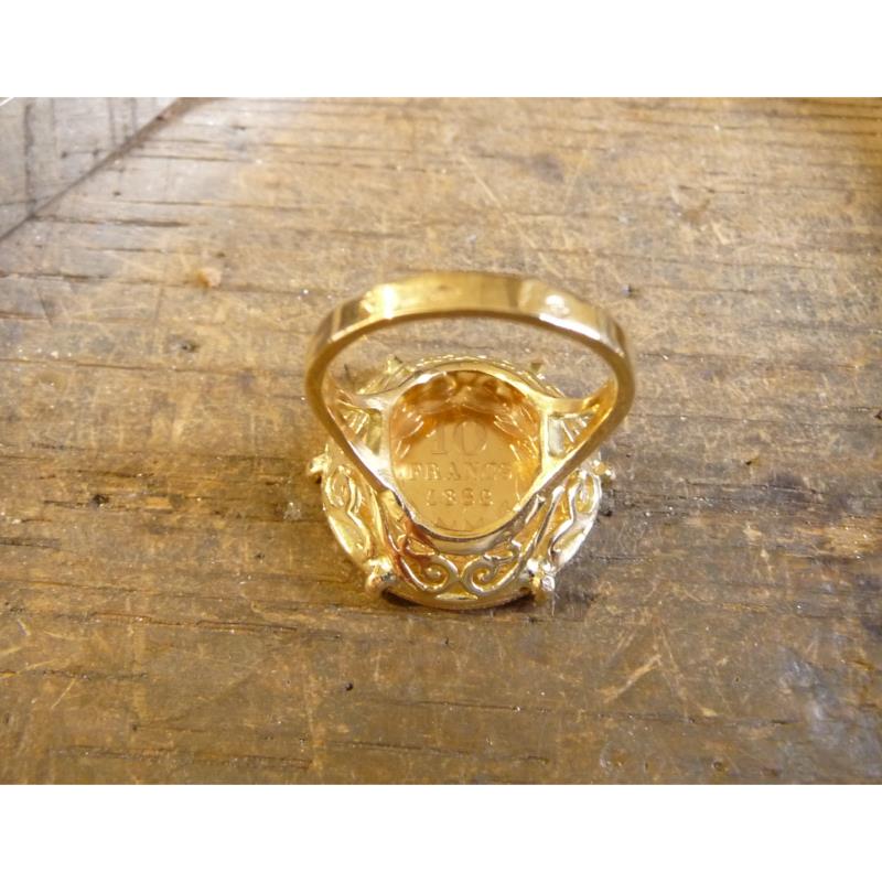 Bague pièce or 18 carats panier repercé arabesque 6 griffes avec pièce de 10 Francs or Napoléon
